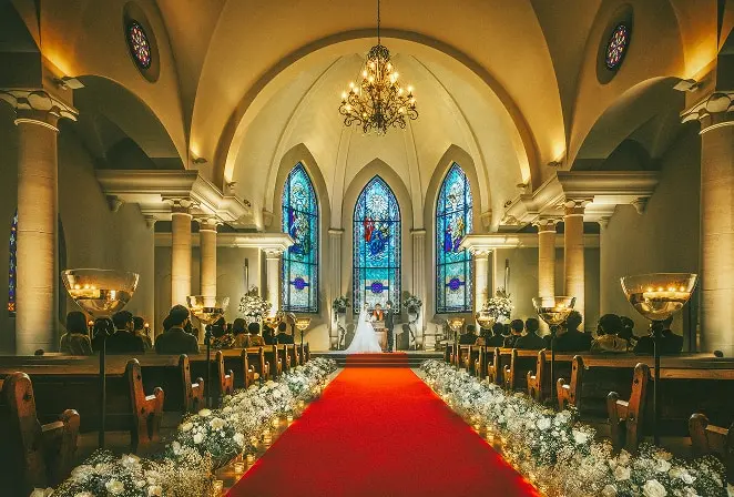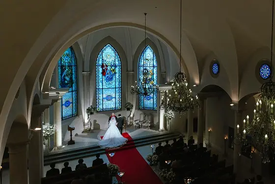 ふたりの生涯にわたり大切な想い出となる挙式。訪れたカップルの約9割がここでの挙式を願います。ヨーロッパ建築の美に囲まれた美しい誓いの時、その温かさがふたりと参列者の心を打ちます。