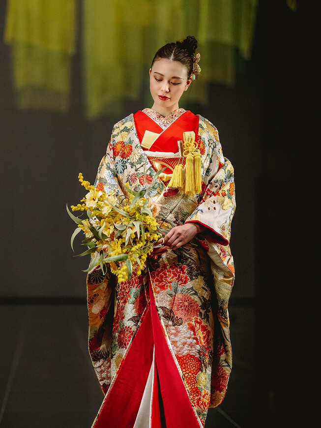 世界に誇る日本の伝統、着物。美しい織に華やかな染めや手刺繍が咲き誇るよう。ヘアアレンジやブーケはもちろん、半襟や筥迫など和装ならではの色あわせや小物あわせで、着こなすことを楽しんで。