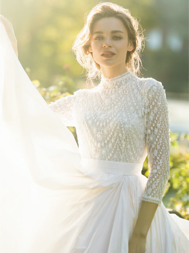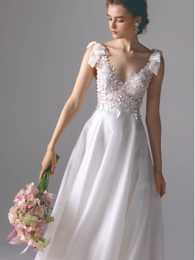 まろやかなシルクの艶や軽やかに揺れるシフォン、やさしく体に寄り添うジョーゼット…高品質な生地を贅沢に。繊細なレースや細やかな刺繍、煌めくビジューも彩って「白」の存在感をひと際大きく。