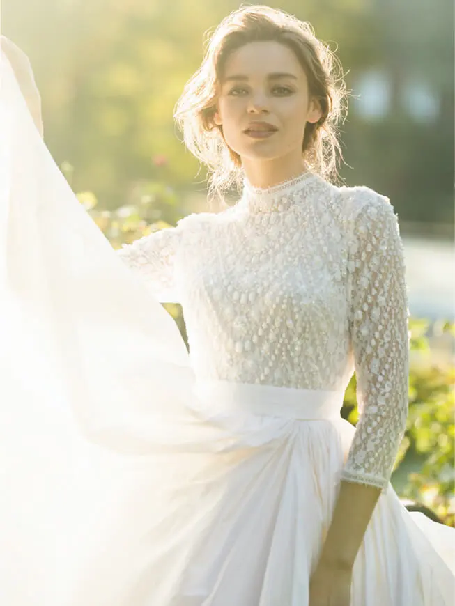 まろやかなシルクの艶や軽やかに揺れるシフォン、やさしく体に寄り添うジョーゼット…高品質な生地を贅沢に。繊細なレースや細やかな刺繍、煌めくビジューも彩って「白」の存在感をひと際大きく。