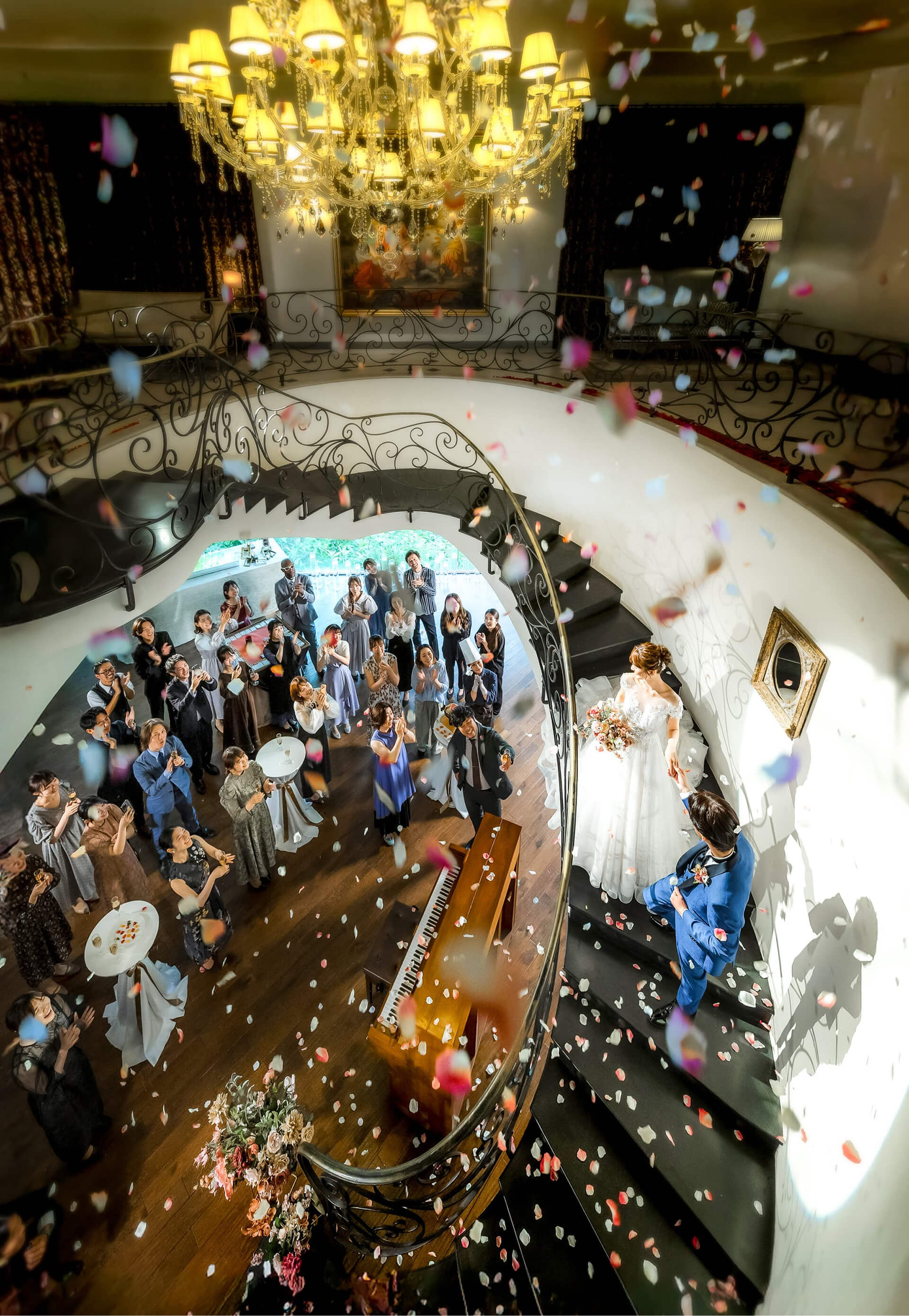 らせん階段が優雅なホワイエから木々と上質な趣が調和するバンケット、陽光あふれるデザートルームへ。移り変わる場面とともに空気がほぐれ、ふたりもゲストも自ずと笑顔になることでしょう。ゆるりとした時間の流れに身をまかせて。