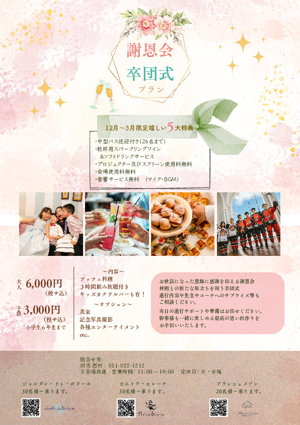 春の息吹を感じる季節、それは出会いと別れが交差する、心温まる時。 長きにわたりお世話になった恩師への感謝を込めた謝恩会、共に歩んだ仲間たちの新たな旅立ちを祝う卒団式。 門出を祝う特別な宴を、洗練されたお料理と、心安らぐ空間で演出いたします。 記憶に残る感動と笑顔に満ちた一日を、私たちが心を込めてお手伝いします。 未来への希望を胸に、忘れられない、特別な一日を共に創りませんか。